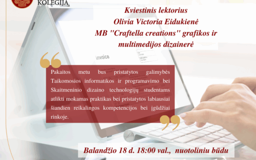 Kviestinio lektoriaus paskaita Technologijų katedros studentams, kurią ves MB „Craftella creations“ grafikos ir multimedijos dizainerė Olivia Victoria Eidukienė