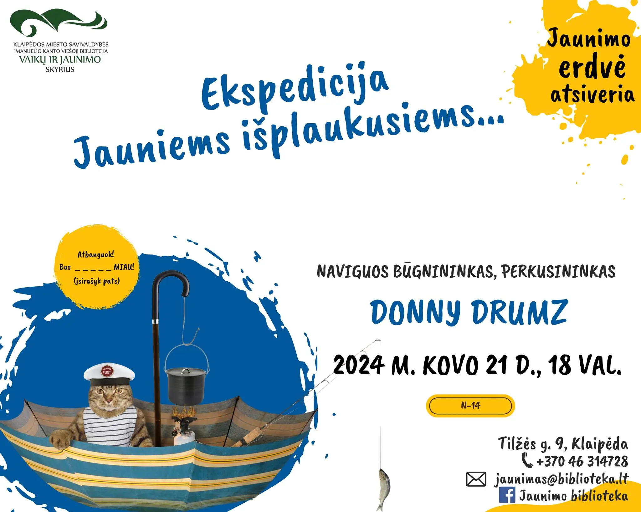 Kovo 21 d., ŠĮ KETVIRTADIENĮ, 18 val., pasaulinės vandens dienos išvakarėse, kartu su tokiais pat kaip Tu – smalsiais, drąsiais, kūrybingais… „išplaukusiais“ bendraamžiais patirk smagų nuotykį bibliotekoje – Jaunimo erdvės atidarymo renginyje „EKSPEDICIJA JAUNIEMS IŠPLAUKUSIEMS…“ (N-14). Naviguos, improvizuos ir Tave nuostabiai skambančiais instrumentais groti kvies būgnininkas, perkusininkas Donny Drumz. Renginys NEMOKAMAS! ?