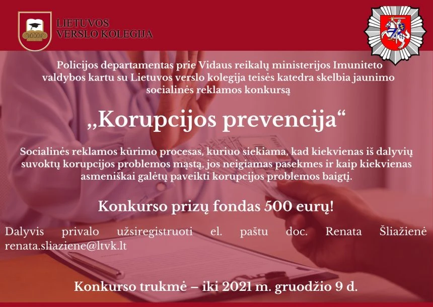 Policijos departamentas prie Vidaus reikalų ministerijos Imuniteto valdybos kartu su Lietuvos verslo kolegija teisės katedra skelbia jaunimo socialinės reklamos konkursą ,,Korupcijos prevencija”.