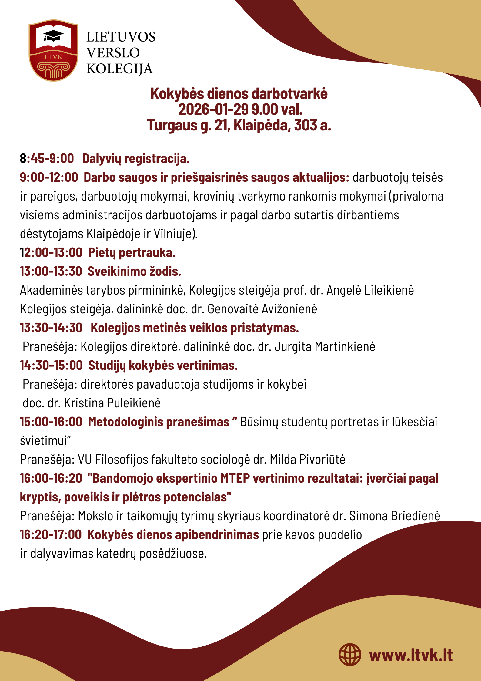 2026 m. sausio 29 d. Lietuvos verslo kolegijoje Klaipėdoje vyks Kokybės diena, skirta studijų, institucijos veiklos ir strateginių krypčių aptarimui. Renginio metu bus pristatytos kolegijos metinės veiklos, studijų kokybės vertinimo rezultatai, metodologinis pranešimas apie būsimų studentų lūkesčius bei bandomojo ekspertinio MTEP vertinimo įžvalgos. Taip pat kokybės dienos metu vyks kasmetiniai privalomi darbuotojų saugos ir priešgaisrinės saugos mokymai. Renginį užbaigs diskusija ir dienos apibendrinimas.