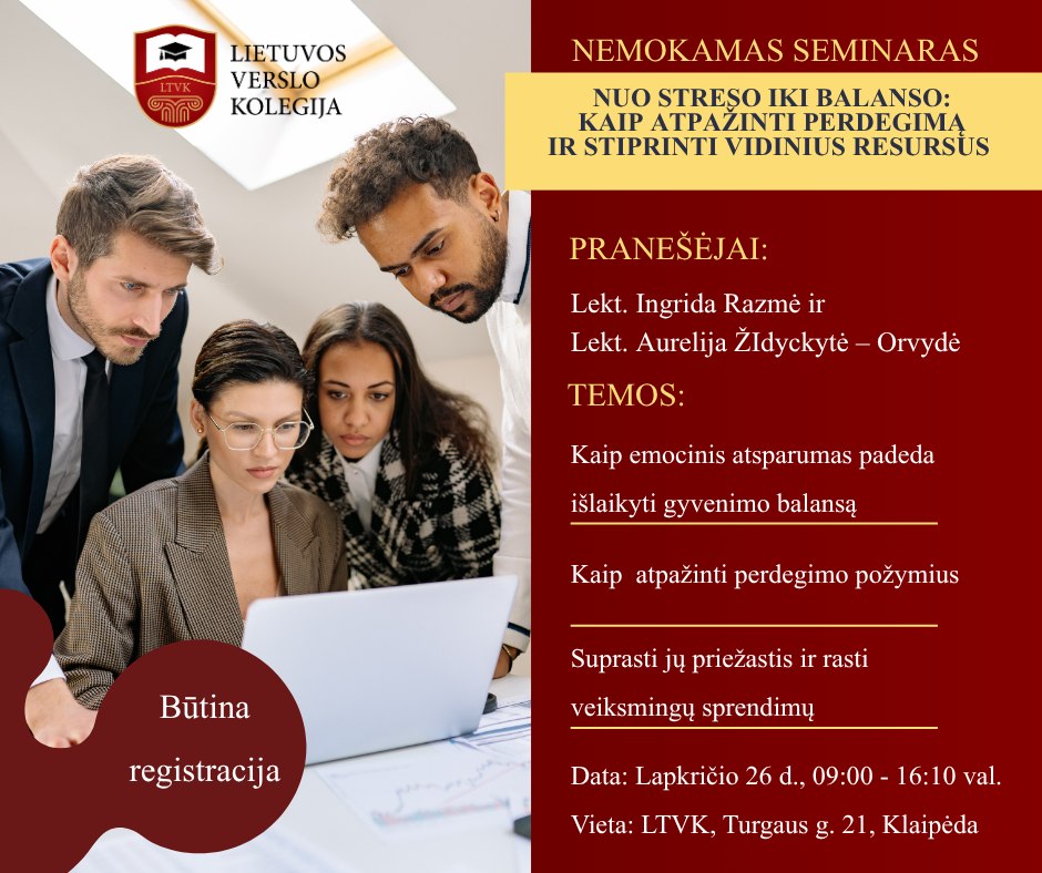 Seminare bus nagrinėjama, kaip emocinis atsparumas padeda išlaikyti gyvenimo balansą, atpažinti perdegimo požymius, suprasti jų priežastis ir rasti veiksmingų sprendimų. Seminaras vyks interaktyvia forma – bus diskutuojama, analizuojamos realios situacijos ir atliekamos praktinės užduotys, kad įgytos žinios būtų lengvai pritaikomos kasdienybėje.