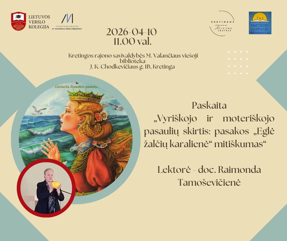 Lietuvos verslo kolegija, įgyvendindama socialinės atsakomybės ir mokymosi visą gyvenimą principus, bendradarbiaudama su Trečiojo amžiaus universitetu (TAU), kviečia III amžiaus universiteto bendruomenę į prasmingą paskaitą, kuri vyks Kretingos rajono savivaldybės M. Valančiaus viešojoje bibliotekoje – čia kolegijos atstovė, lektorė doc. Raimonda Tamoševičienė ves seminarą „Vyriškojo ir moteriškojo pasaulių skirtis: pasakos „Eglė žalčių karalienė“ mitiškumas“, skirtą gilinti kultūrinį suvokimą, skatinti kritinį mąstymą ir pritaikyti senąsias įžvalgas šiandienos gyvenime.