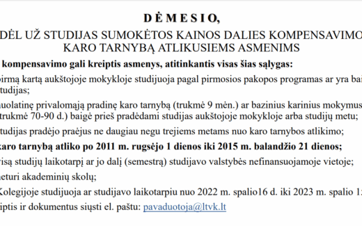 Dėmesio, dėl už studijas sumokėtos kainos dalies kompensavimo karo tarnybą atlikusiems asmenims