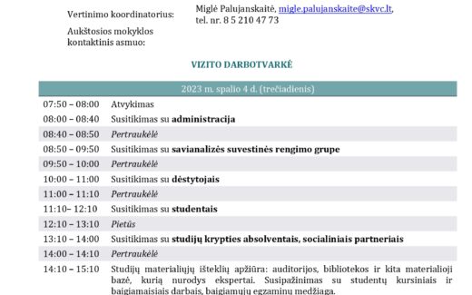 Išorinio tarptautinio Teisės studijų krypties vertinimo darbotvarkė Lietuvos verslo kolegijoje