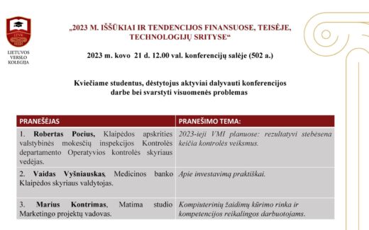 Mini konferencija „2023 M. IŠŠŪKIAI IR TENDENCIJOS FINANSUOSE, TEISĖJE, TECHNOLOGIJŲ SRITYSE“