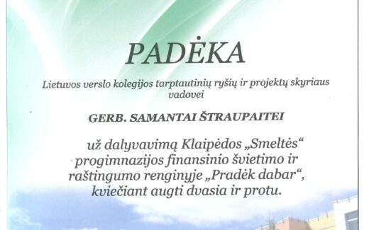 Šiandien Lietuvos verslo kolegijos Tarptautinių ryšių ir projektų skyriaus vadovė Samanta Štraupaitė lankėsi „Smeltės“ progimnazijoje