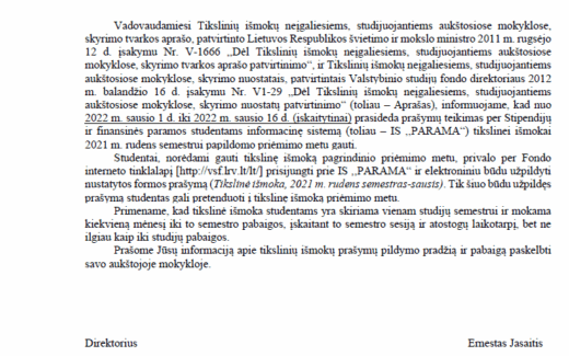 DĖL PARAIŠKŲ PILDYMO TIKSLINEI IŠMOKAI 2021 M. RUDENS SEMESTRO PAPILDOMO PRIĖMIMO METU SAUSIO MĖN. GAUTI