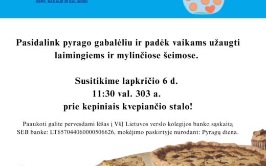 Lietuvos verslo kolegija tradiciškai jungiasi prie „SOS vaikų kaimai Lietuva akcijos“ ir kviečia visą LTVK bendruomenę prisidėti prie Pyragų dienos!