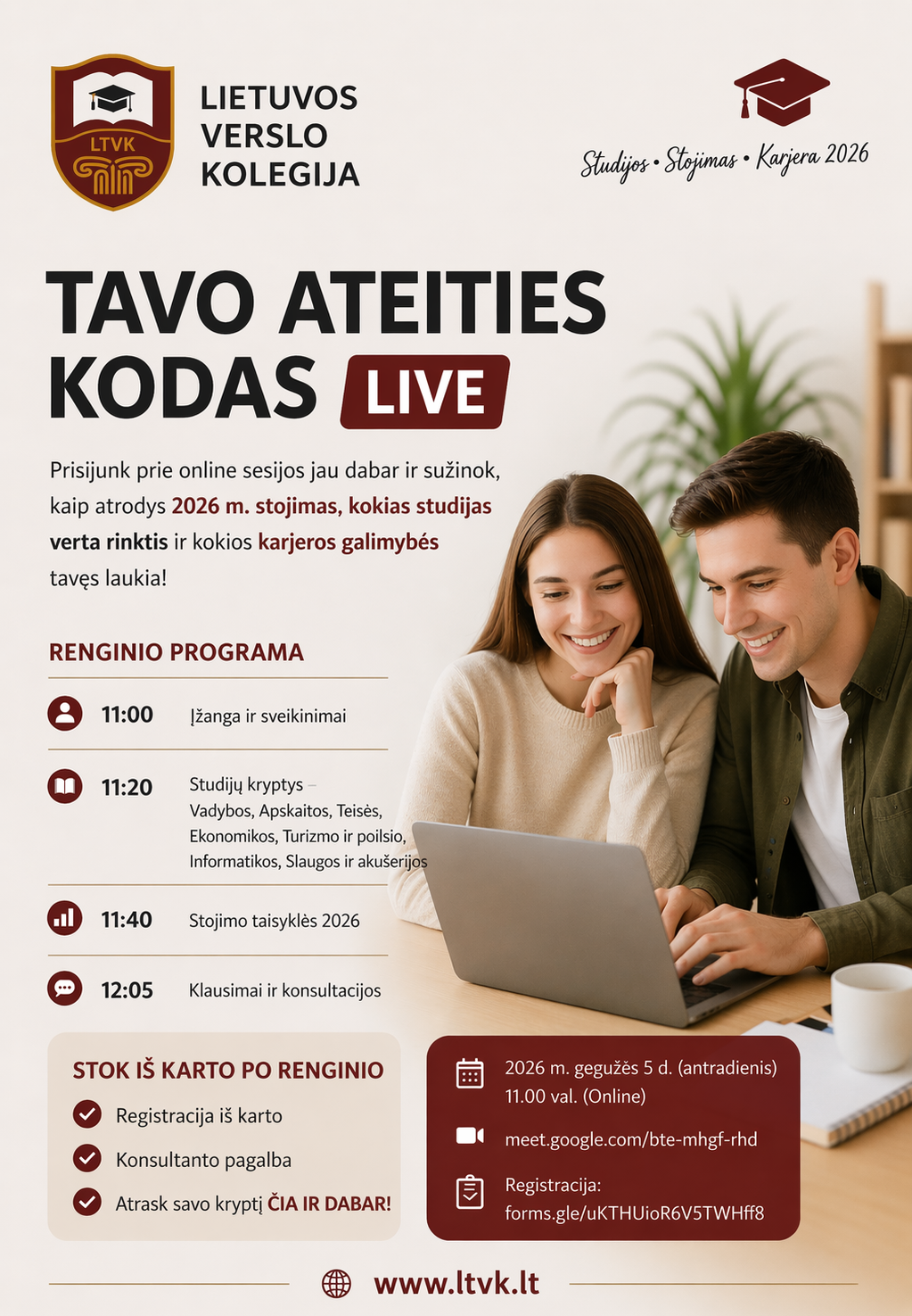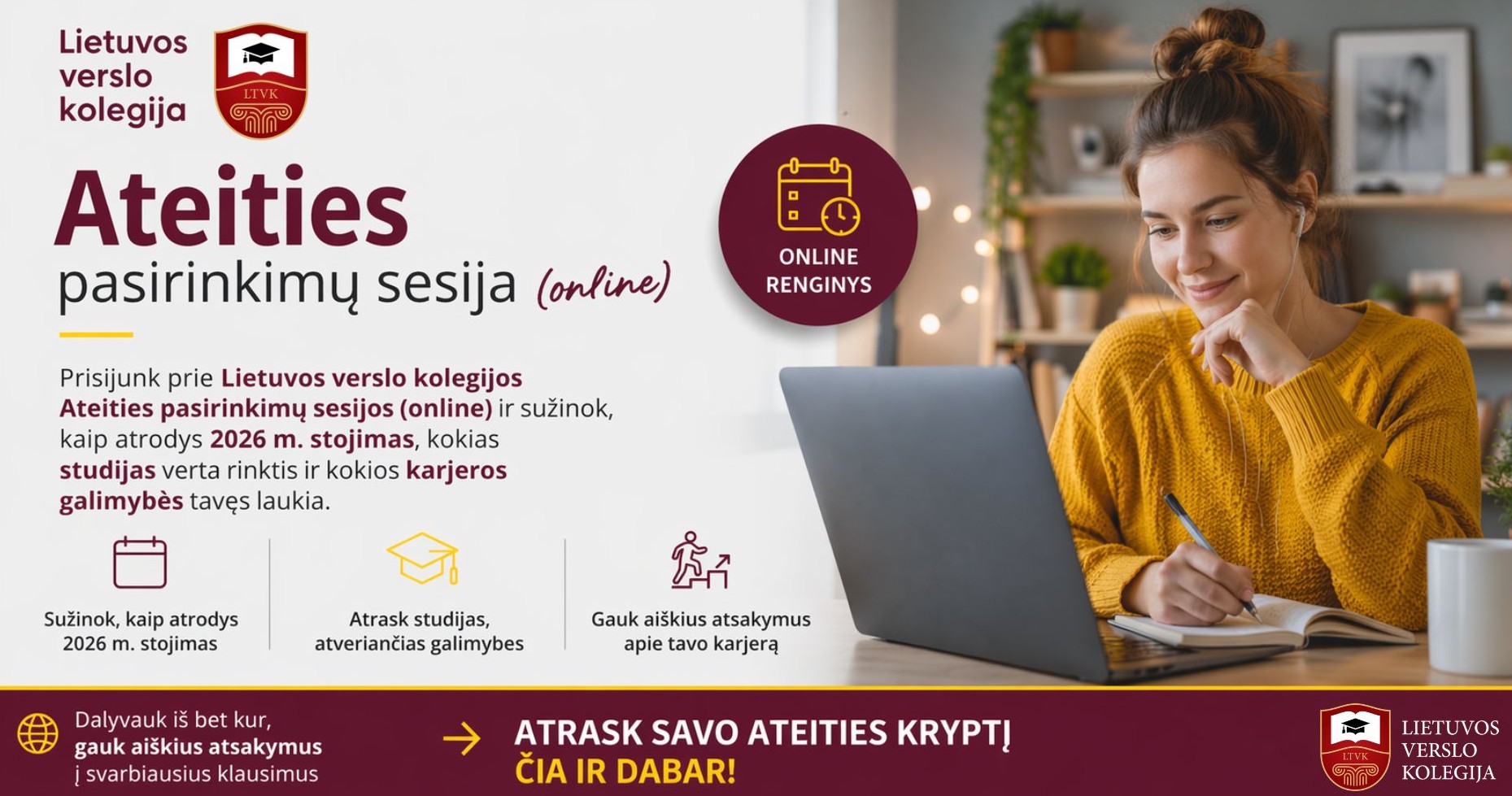 Kviečiame Tave į nuotolinę Lietuvos verslo kolegijos Ateities pasirinkimų sesiją (online): „Tavo ateities kodas LIVE: studijos, stojimas ir karjera 2026“
