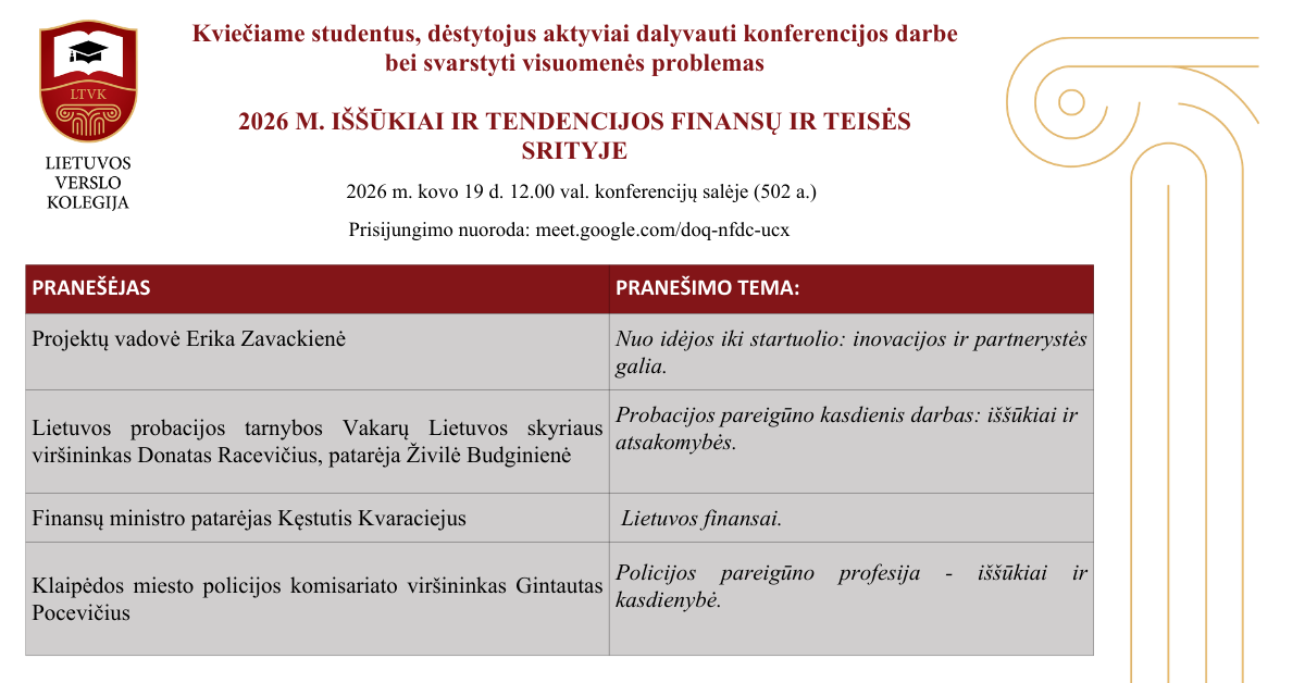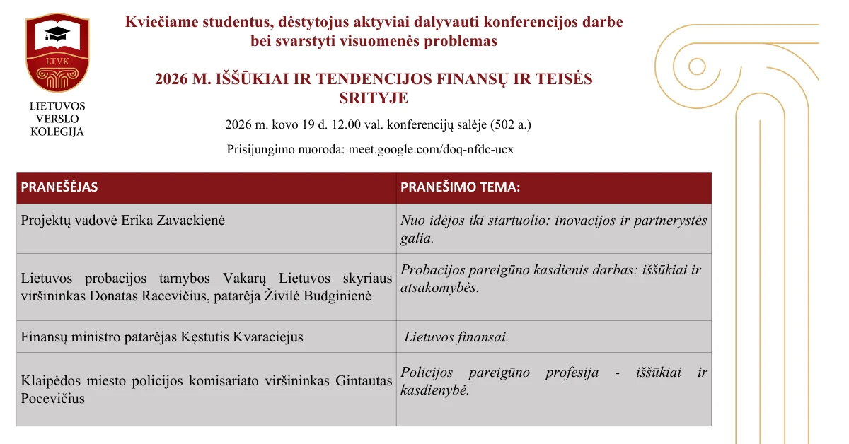 Lietuvos verslo kolegija kviečia studentus, dėstytojus ir visuomenės atstovus dalyvauti Kolegijos Teisės ir Ekonomikos katedrų organizuojamoje konferencijoje „2026 m. iššūkiai ir tendencijos finansų ir teisės srityje“, kurioje bus diskutuojama apie aktualius finansų, teisės ir viešojo saugumo klausimus.